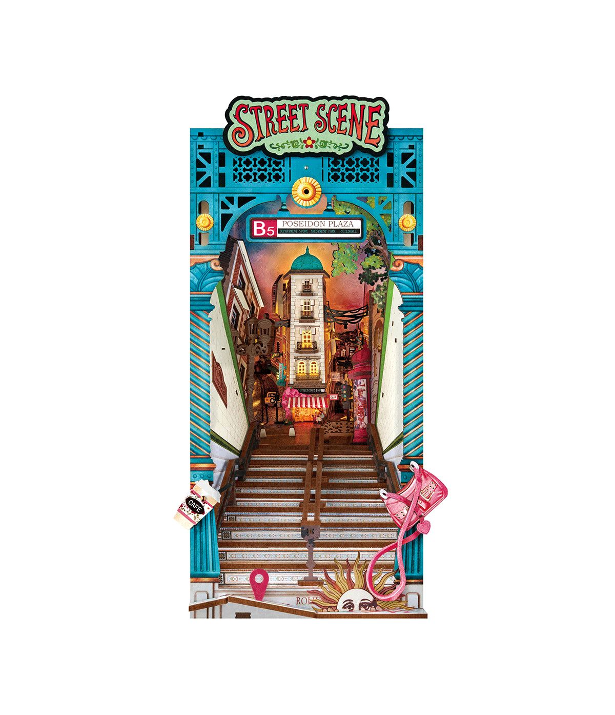 Kom med på tur til en gammel bydel i en storby med gamle trapper og smukke gamle huse. Du bygger selv bydelen af 196 brikker/dele. Den er lige til at sætte på bogreolen som bogstøtte sammen med dine bøger. Det her fine DIY 3D-puslespil har 196 brikker/dele, og du får præcise instruktioner til, hvordan du samler det. Der følger ledninger med til en lille lampe inden i puslespillet, så den færdige Book Nook kan lyse fint op.