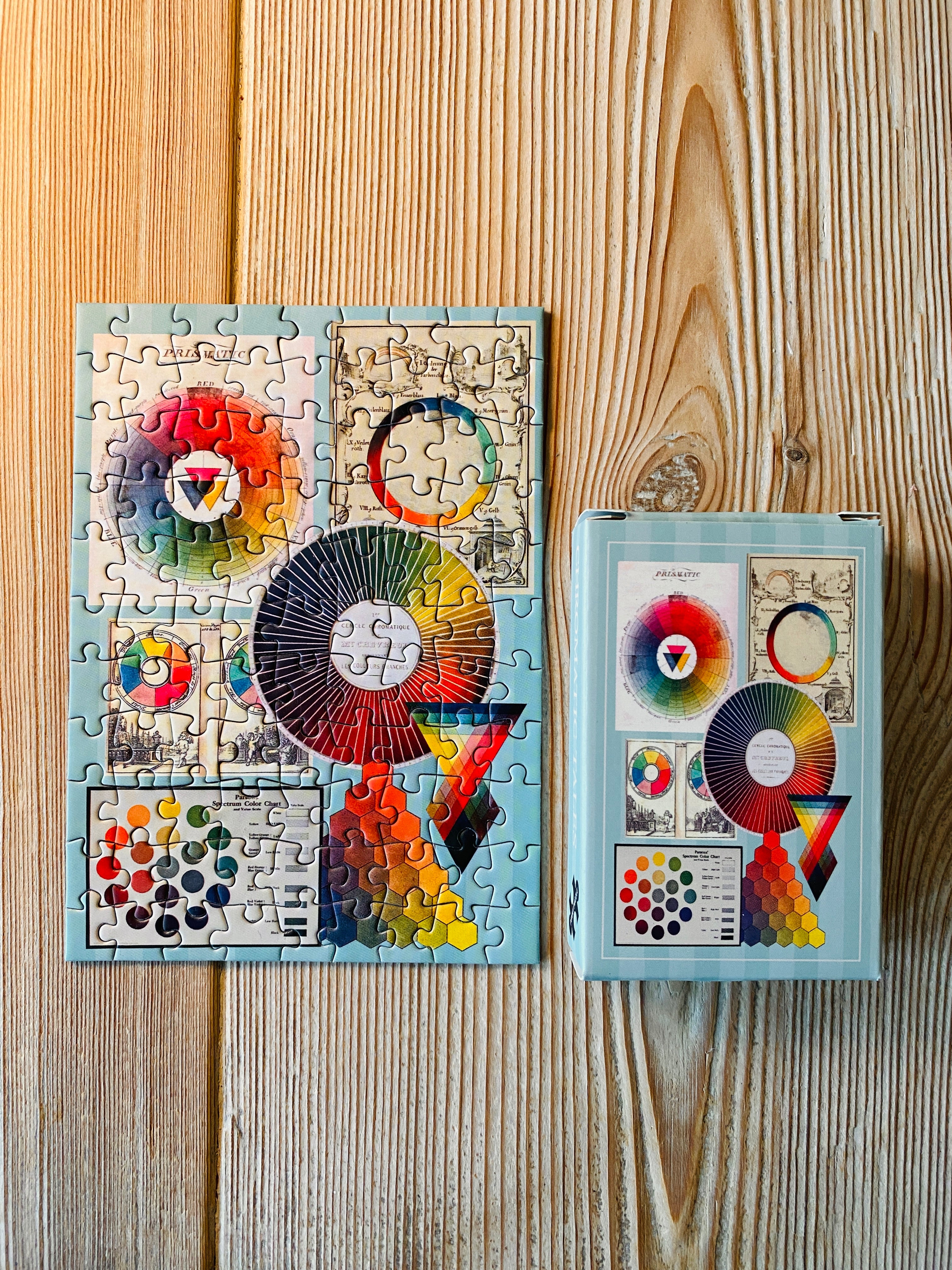 Superfint puslespil i ministørrelse med 99 brikker og meget gamle illustrationer af farveteori. Puslespillet er i smukke varme farver og med mange fine detaljer.