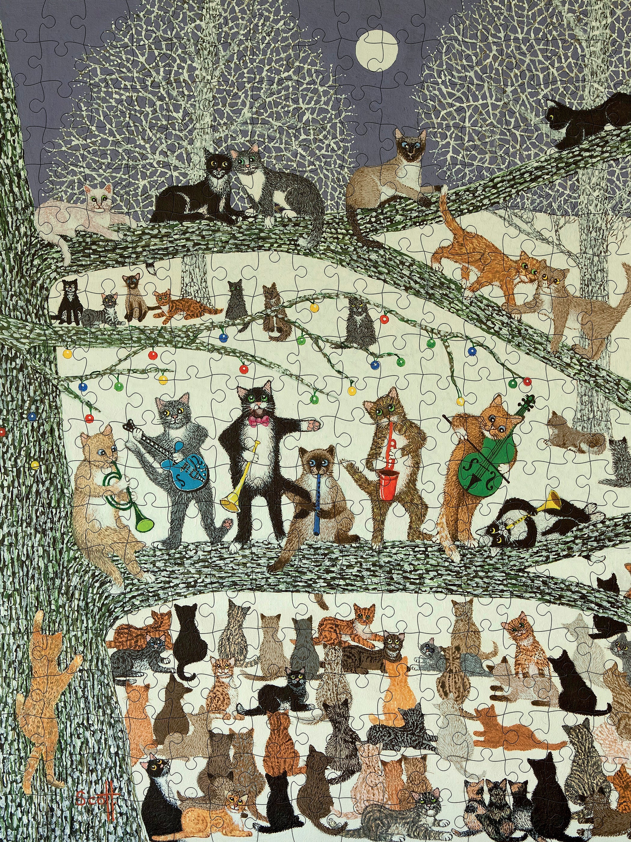 Et ægte kattepuslespil med masser af katte, som holder koncert i det store træ og nyder hinandens selskab.