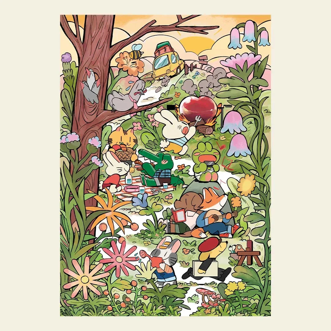 Skabt af kunstneren Chiara Fiordeponti tager dette puslespil med 500 brikker dig med til et fredfyldt hjørne af naturen, hvor skovens dyr slapper af til en farverig picnic.
