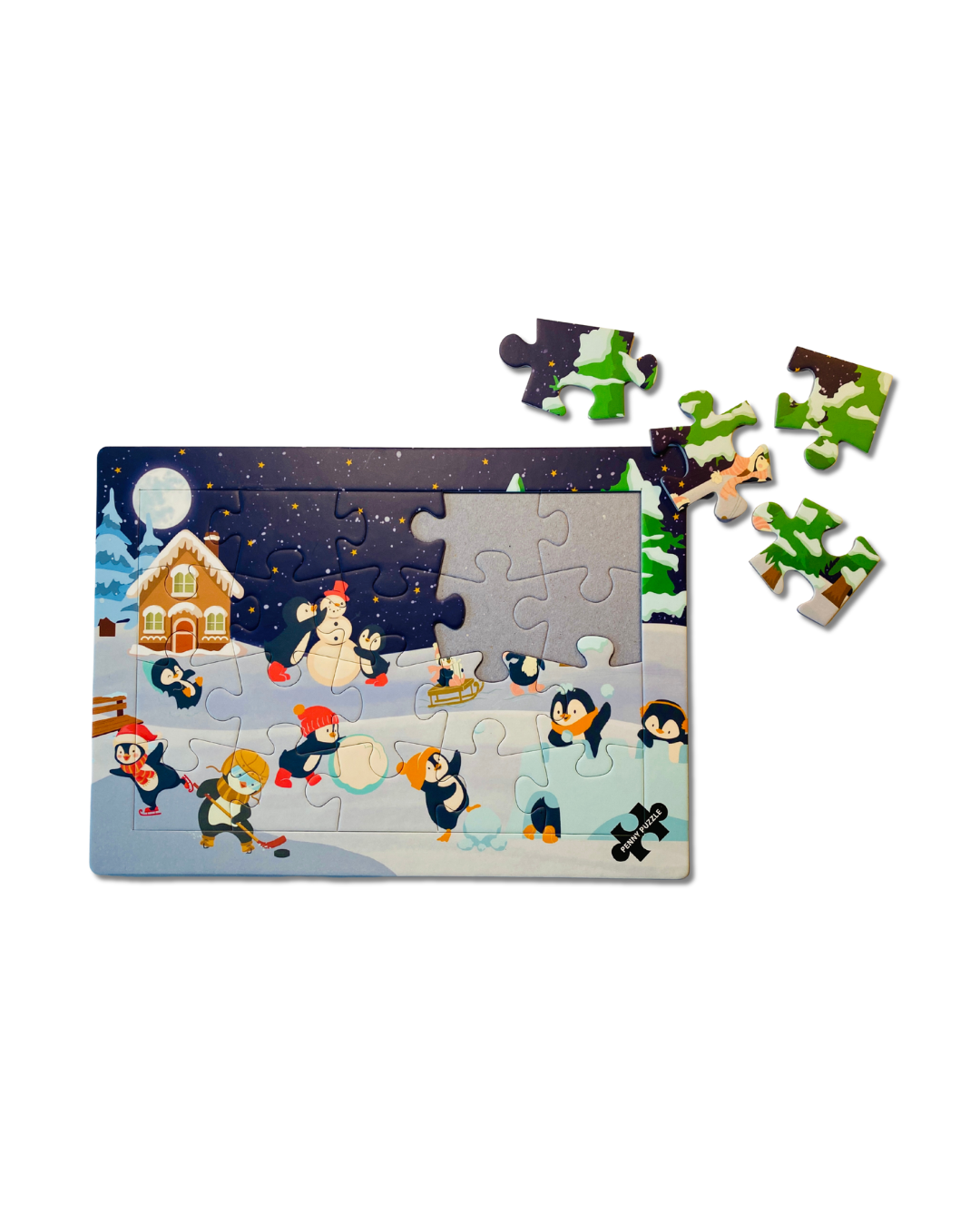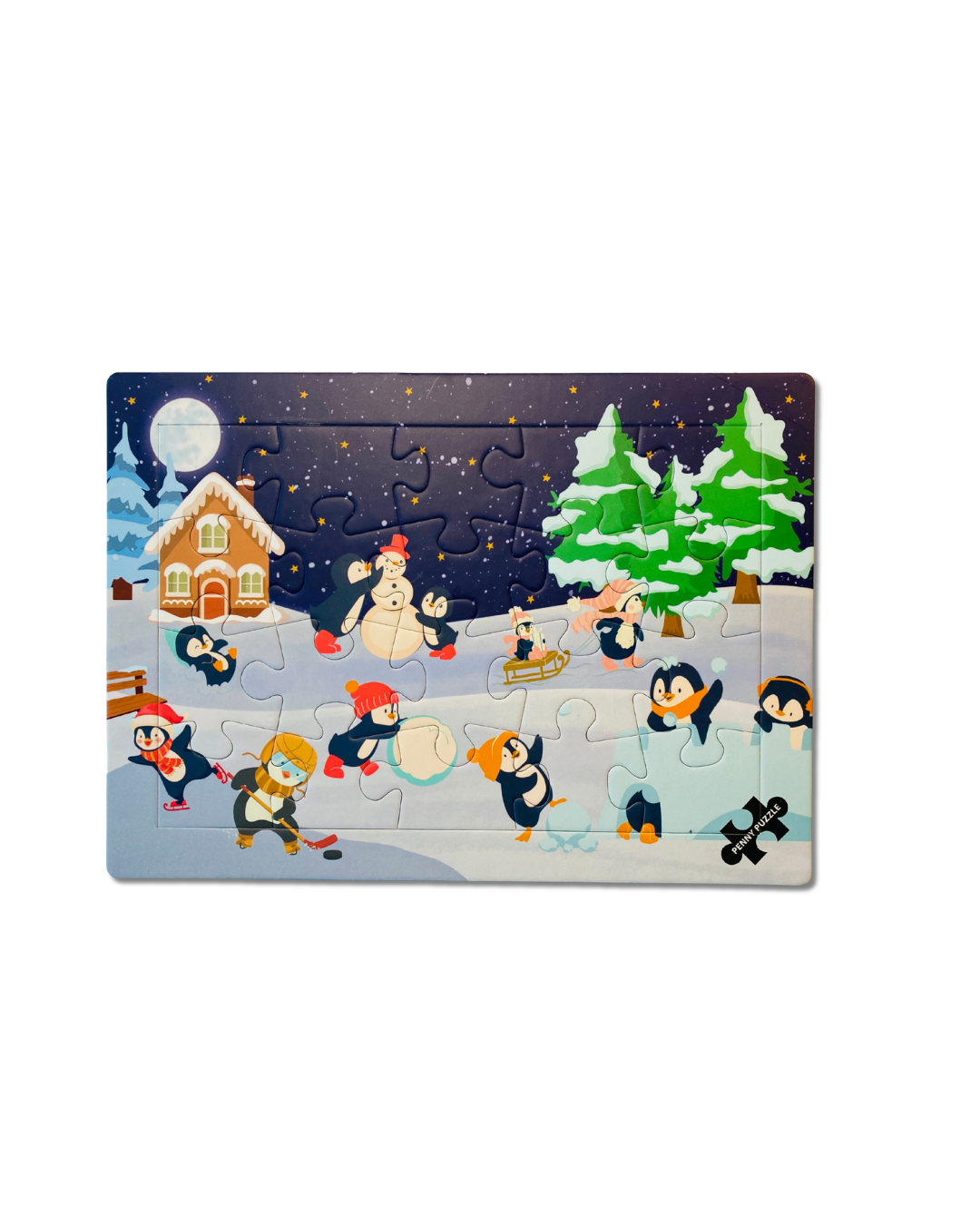 Der skal 20 brikker til at samle dette lærerige puslespil med små legesyge pingviner, som boltrer sig i sneen. De synes slet ikke, at det er koldt.
